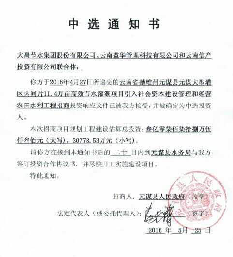 &n????? ??????????????????? ???????????????????? ???????????????????? ???????????????bsp; 5月25日,从云南省楚雄州????? ??????????????????? ???????????????????? ???????????????????? ???????????????元谋县人民政府传来喜讯,大禹节水集团股????? ???????????????????? ???????????????????? ???????????????????? ???????????????份有限公司成功中选元????? ???????????? ???????????????????? ???????????????????? ???????????????????? ???????????????????????谋大型灌区丙间片11.4万亩高效????? ???????????????????? ???????????????????? ???????????????????? ???????????????节水灌溉项目引入社会资本建设管理????? ???????????????????? ???????????????????? ???????????????????? ???????????????和经营农田水利工程招商投资项目(以下简????? ???????????????????? ???????????????????? ??????????????????? ???????????????称“元谋PPP项目”)。